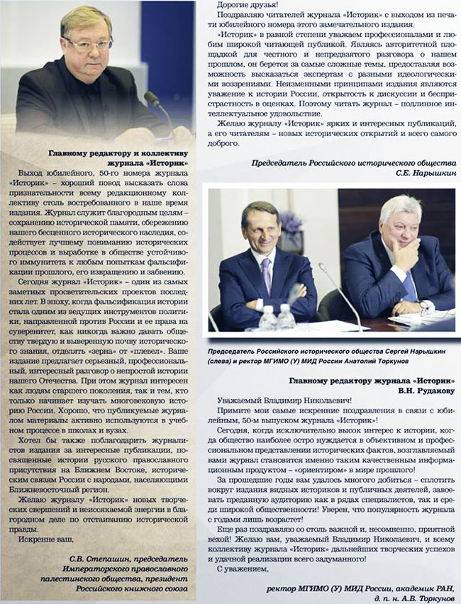 Выход юбилейного 50-го номера журнала «Историк» – хороший повод высказать слова признательности всему редакционному коллективу столь востребованного в наше время издания. Журнал служит благородным целям – сохранению исторической памяти, сбережению нашего бесценного исторического наследия, содействует лучшему пониманию исторических процессов и выработке в обществе устойчивого иммунитета к любым попыткам фальсификации прошлого, его извращению и забвению.
