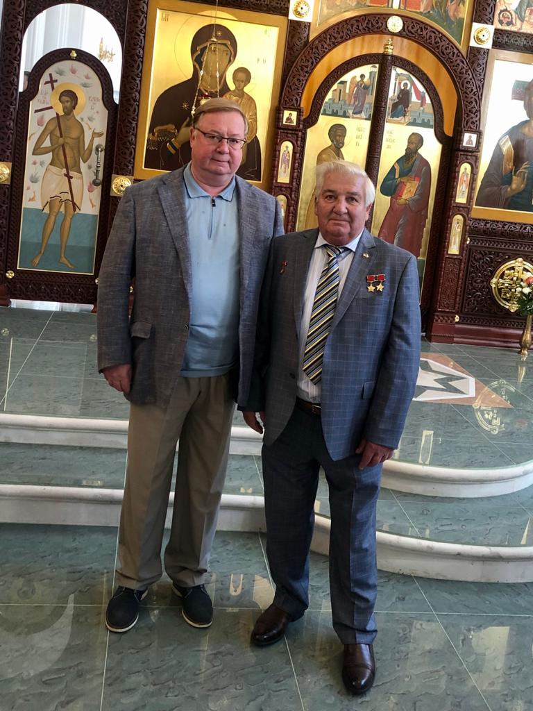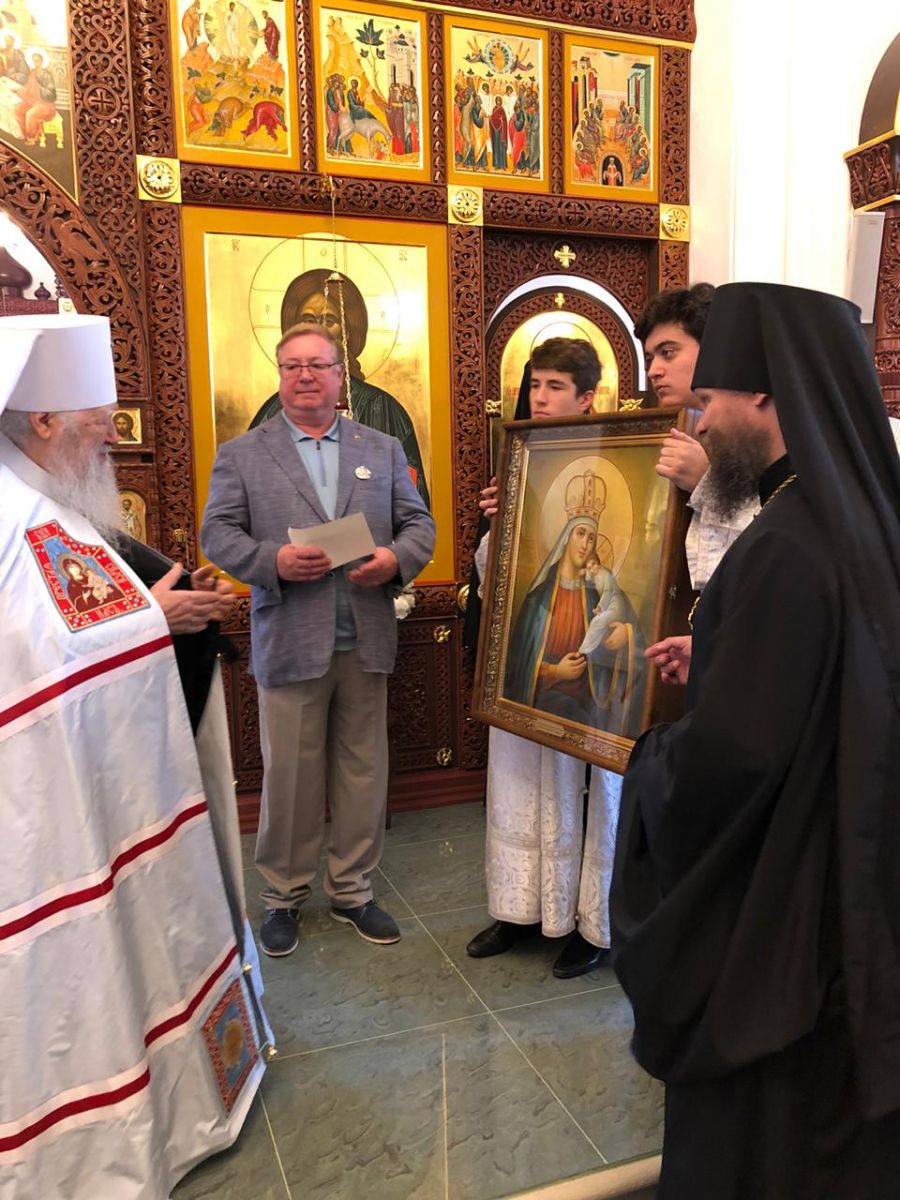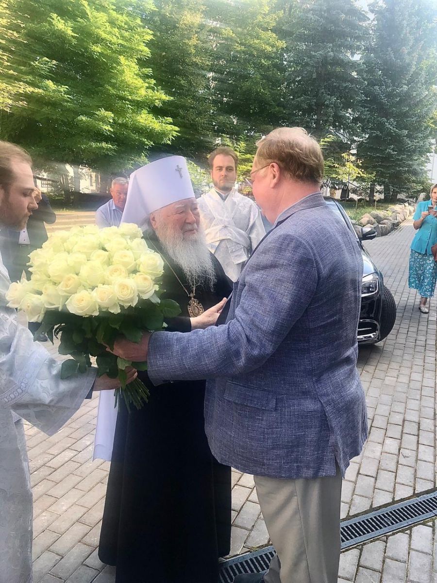 Сергей Степашин преподнёс в дар храму икону Божией Матери. Владыка вручил Председателю ИППО букет белых роз.