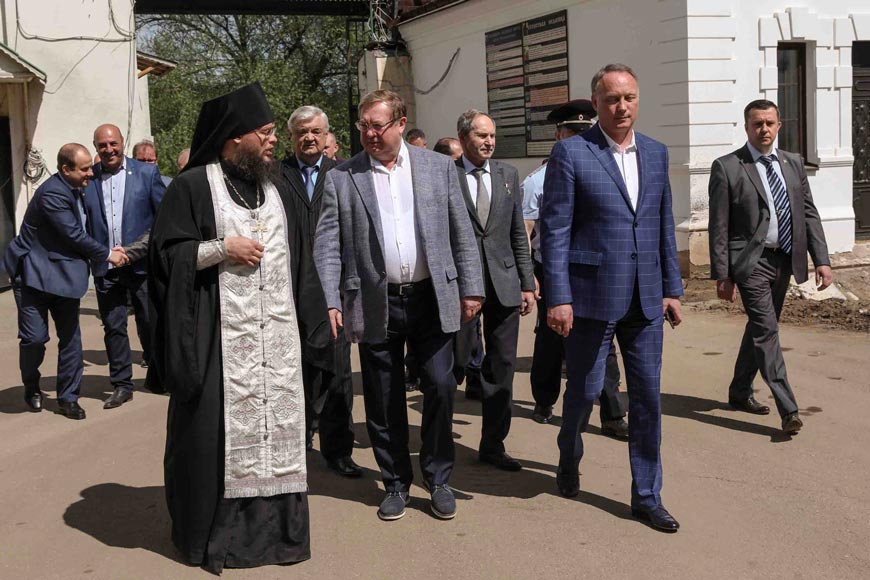 В обительских Святых вратах делегацию ИППО и высоких гостей встречали члены Московского областного отделения ИППО: игумен Евмений (Лагутин), Александр Николаевич Панин (заместитель председателя Московского областного отделения) и С. Я. Ваксман.