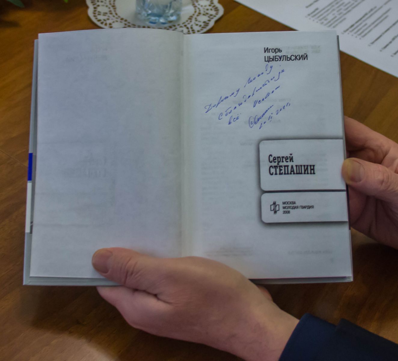 Председатель ИППО Сергей Степашин подписал подарочный экземпляр книги Игоря Цыбульского для генерального директора издательства «ВЕЧЕ» Леонида Палько.