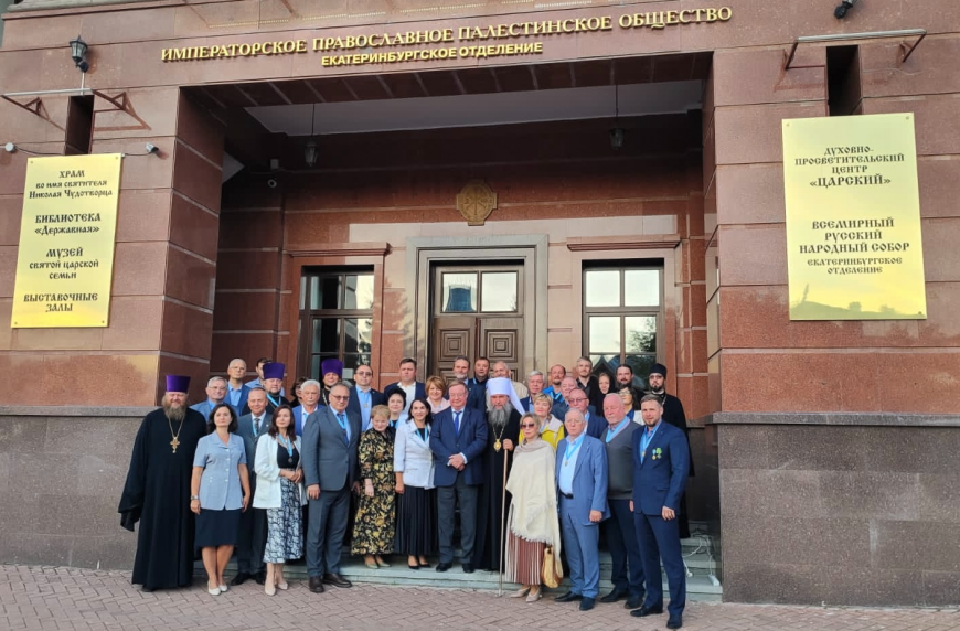 Затем участники встречи почтили память первого руководителя Екатеринбургского отделения Императорского Православного Палестинского Общества Владимира Белоглазова — возложили цветы к барельефу, установленному на фасаде Культурно-просветительского центра «Царский», где размещается офис Екатеринбургского отделения ИППО.
