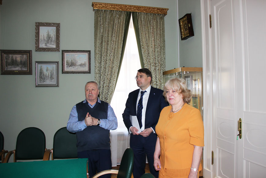 Секретарь ИППО Александр Долинин провёл для гостей, в числе которых был и действительный член ИППО Сергей Чернышов, экскурсию по историческому зданию Центра Общества, выставке народного художника России Владимира Никонова и Музею истории ИППО.