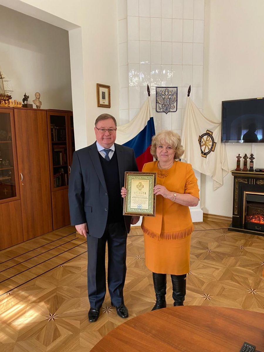 На встрече Сергей Вадимович поблагодарил Елену Александровну за поддержку в выполнении задач на благо Императорского Православного Палестинского Общества и вручил ей грамоту Общества.