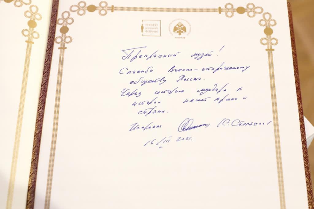 Председатель Императорского Православного Палестинского Общества Сергей Степашин оставил запись в Книге Почетных гостей Музея военной формы.
