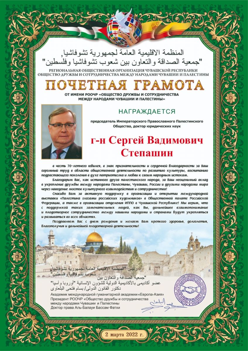 Председатель ИППО Сергей Степашин удостоен Почётной грамоты от имени региональной общественной организации Чувашской Республики «Общества дружбы и сотрудничества между народами Чувашии и Палестины».