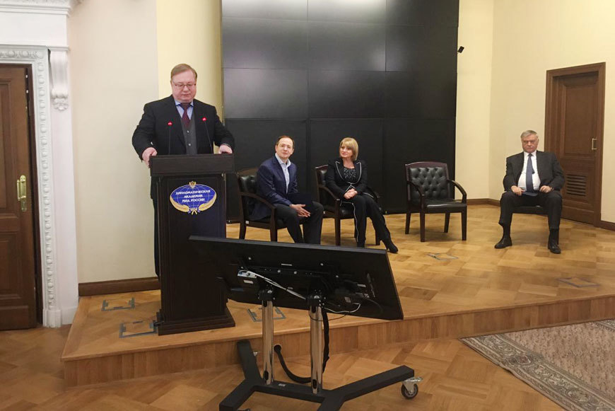 Сергей Степашин выступает с трибуны на сцене, справа – Владимир Якунин, экс-глава РЖД, глава Фонда Андрея Первозванного