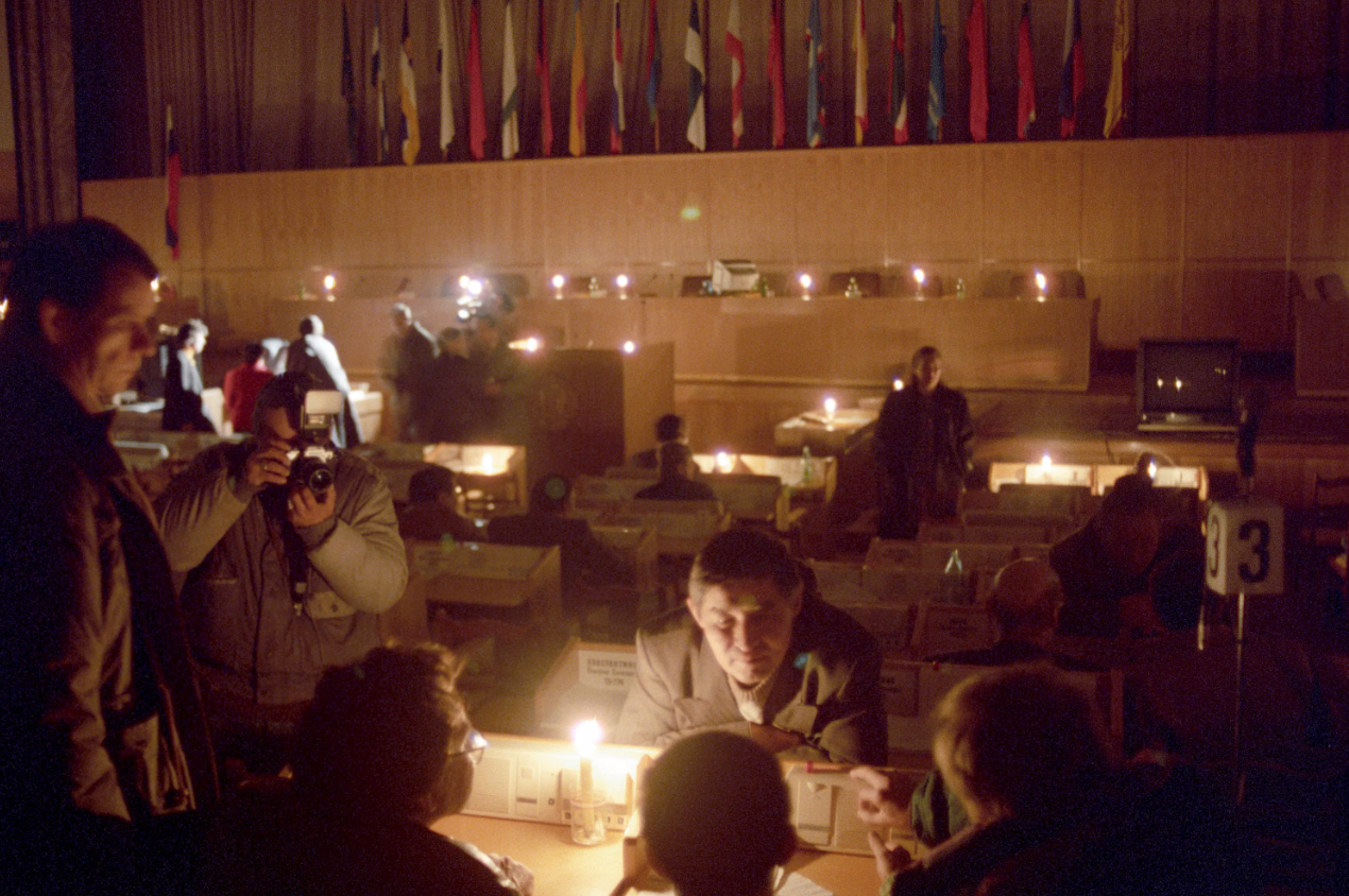 X Чрезвычайный (внеочередной) съезд народных депутатов РФ проходит при свечах. В Доме Советов РФ отключены вода и электричество. Фото: Александр Лыскин/РИА Новости