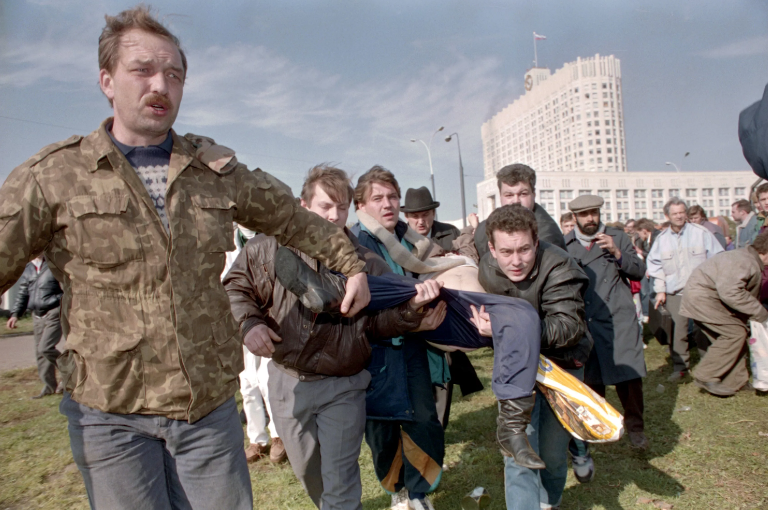 Эвакуация раненого у Дома Советов Российской Федерации. Фото: Александр Неменов/ТАСС