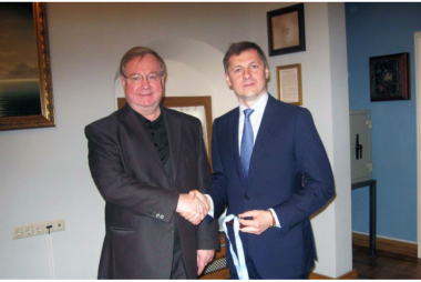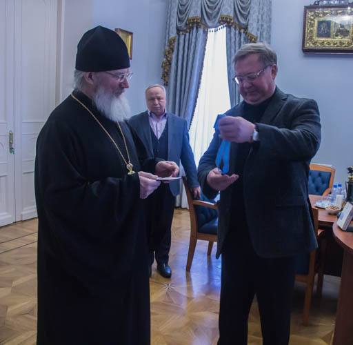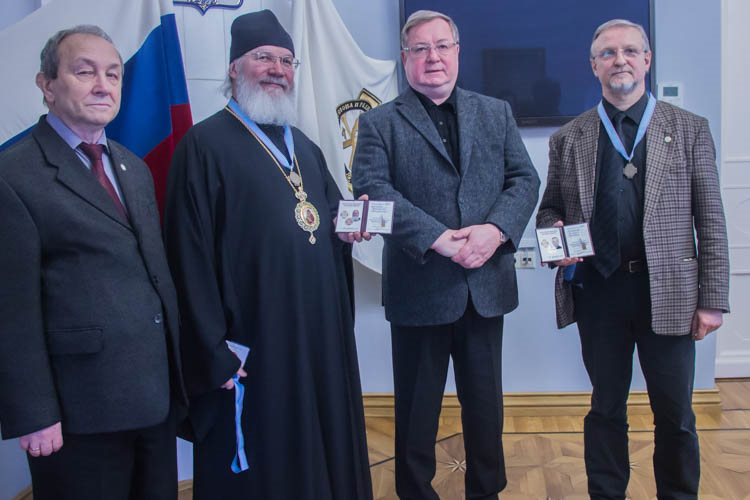 Сергей Степашин вручил членские билеты и нагрудные знаки викарию Святейшего Патриарха Московского и всея Руси Кирилла, наместнику Спасо-Преображенского Валаамского ставропигиального мужского монастыря, Председателю Синодальной комиссии по канонизации святых епископу Троицкому Панкратию.