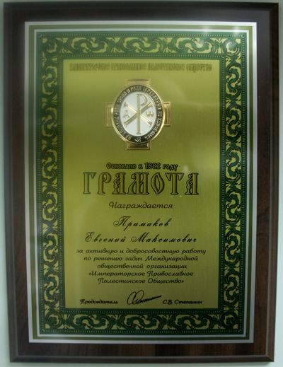 Недавно Евгений Максимович отметил свой 85-летний юбилей и продолжает активно работать на благо Отечества и общества. Ученый-востоковед, государственный деятель, академик Российской Академии наук он активно участвует в работе и Императорского Православного Палестинского Общества, за что неоднократно удостаивался почетных памятных наград ИППО, в том числе высшего знака ИППО - ордена "Вифлеемская Звезда".