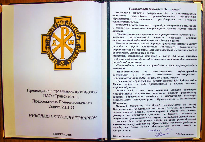 Сергей Вадимович ознакомился с деятельностью компании, поблагодарил председателя Попечительского совета ИППО за оказание реальной помощи Обществу и вручил ему орден Великого князя Сергия Александровича. Накануне он направил официальное поздравление коллективу «Транснефти» с юбилеем.