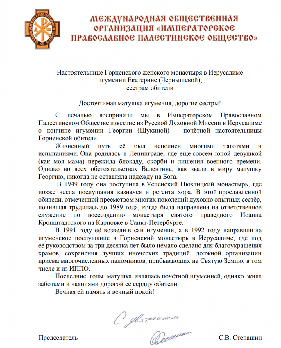 Сергей Степашин выразил соболезнования в связи с кончиной почетной настоятельницы Горненского монастыря в Иерусалиме игумении Георгии (Щукиной)