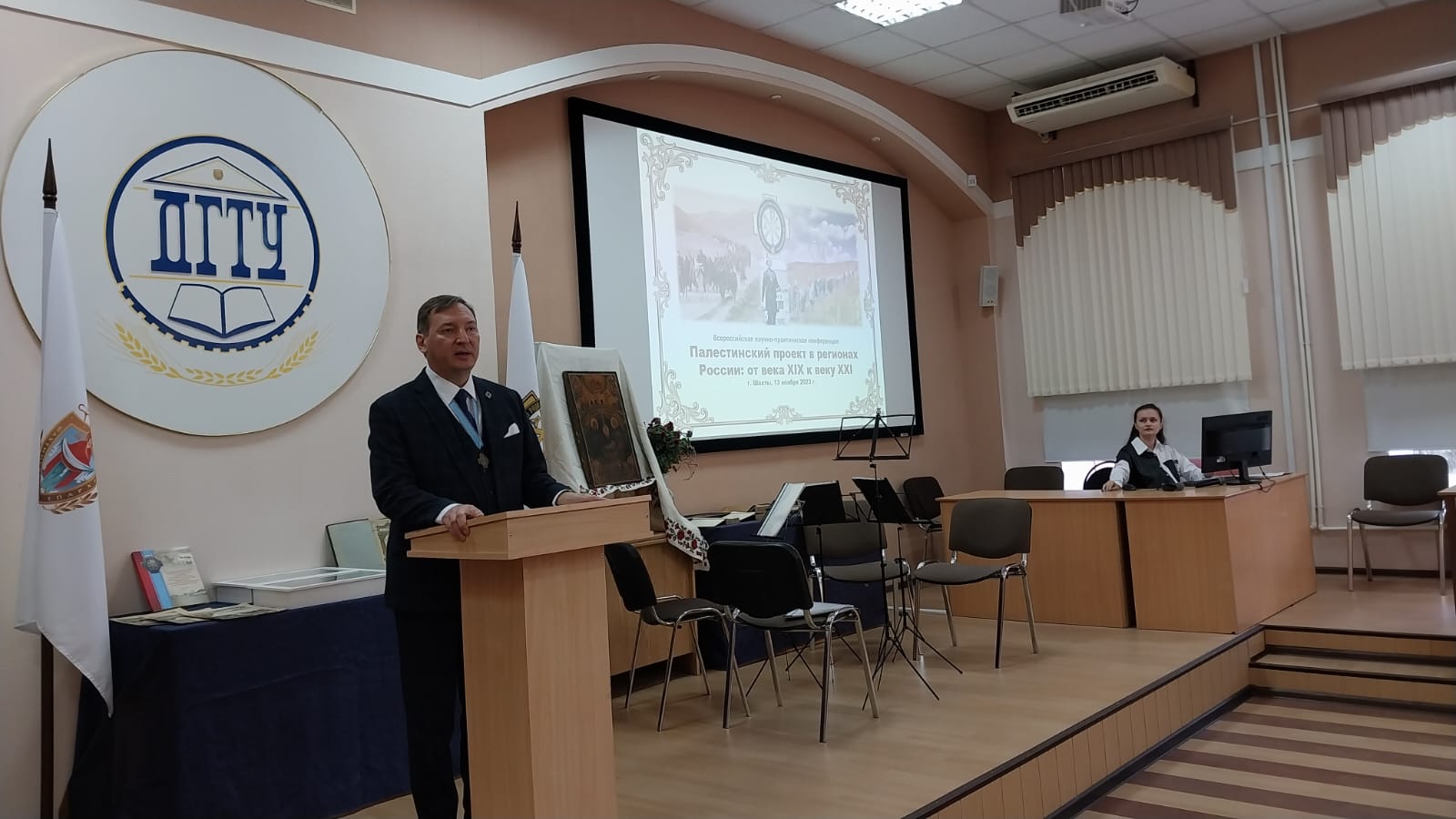 В рамках конференции состоялась презентация выставок: «Святыни Палестины и артефакты, связанные с историей Императорского Православного Палестинского Общества» и «Редкие издания, иллюстрирующие Палестинский проект в России из фондов библиотеки института» (И. Г. Шарков и заведующая библиотекой института О. И. Трубникова).