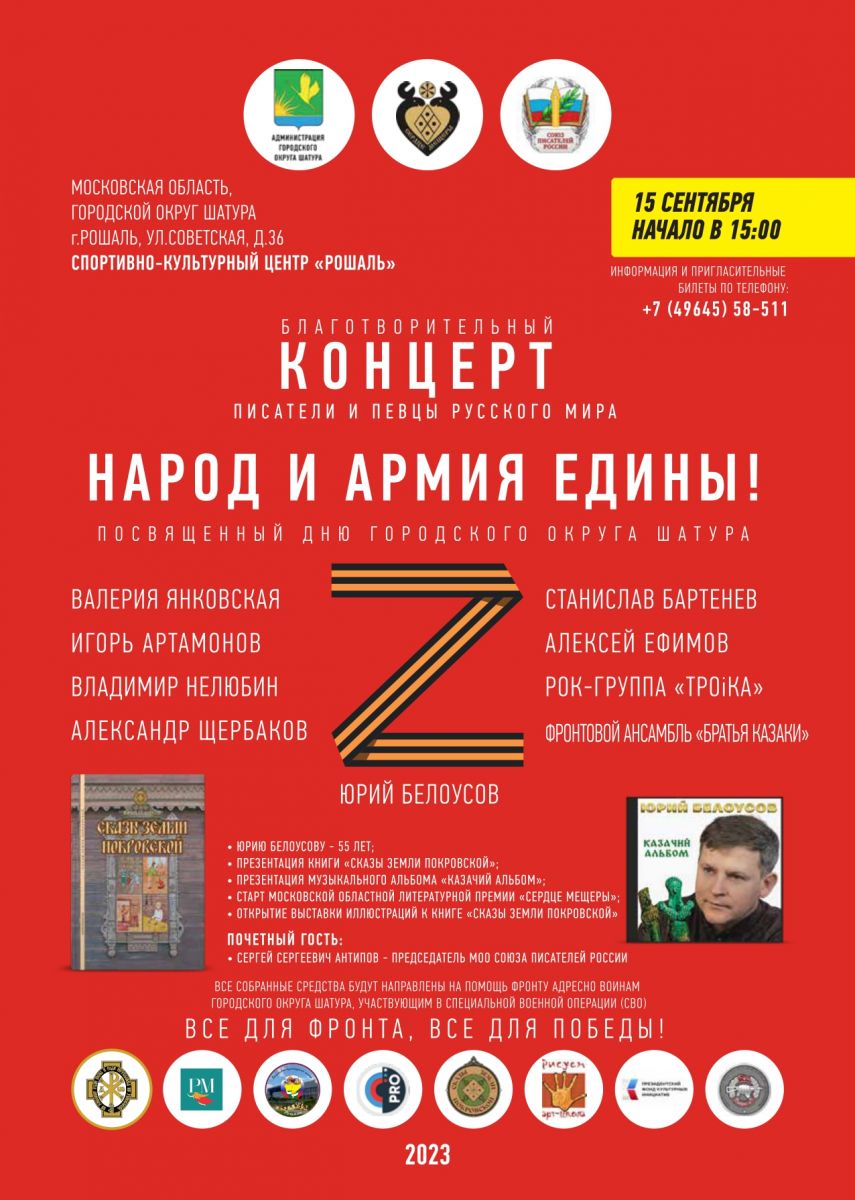15 сентября 2023 года в городе Рошаль городского округа Шатура Московской области в культурно-спортивном центре «Рошаль» состоялся второй в этом году благотворительный концентр звезд Русского мира «Писатели и певцы Русского мира «Народ и армия едины», посвященный дню городского округа Шатура, под лозунгом «Все для фронта, все для победы!»