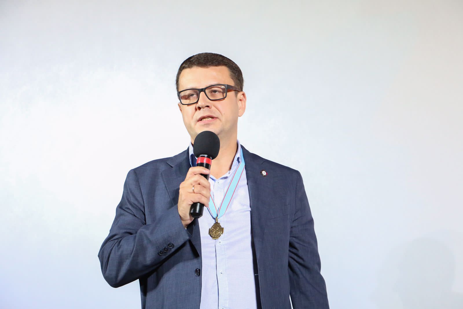Юрия Смирнова (участвовал в мероприятии в онлайн-режиме) вручили награду одному из организаторов благотворительного концерта Юрию Белоусову.