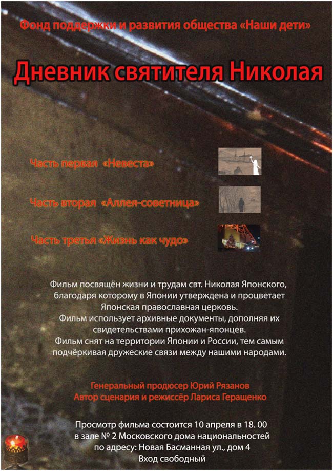 10 апреля 2018 года состоится мастер-класс режиссёра Л. Геращенко по киноагиологии (созданию фильмов о святых) и показ документального фильма с элементами мультипликации «Дневник святителя Николая».