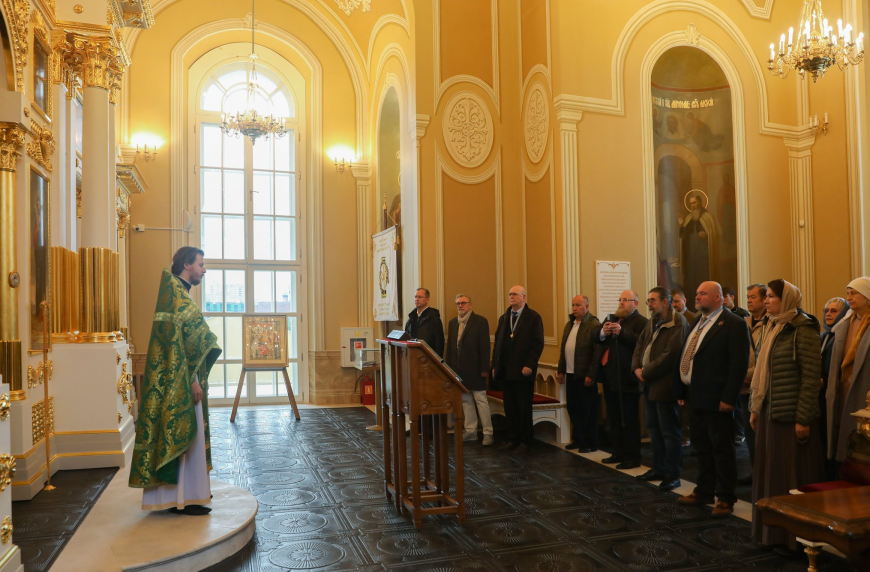 Первую Божественную литургию в домовом храме Общества служил иеромонах Доментиан (Курланов) с братией монастыря. Он произнёс проповедь о победительном смирении перед Господом, пример которого нам подает преподобный Сергий. За первой литургией молились руководитель Научной секции и руководитель отдела региональных программ ИППО Сергей Житенёв, член Совета ИППО князь Григорий Гагарин, заместитель исполнительного директора БФ «Христианское милосердие» Надежда Буракова, председатель Юбилейного комитета к 135-летию Восточного путешествия Наследника Цесаревича Николая Александровича писатель А.Ю. Хвалин, члены Молодежной секции Общества, а также другие действительные члены старейшей в России международной общественной организации.