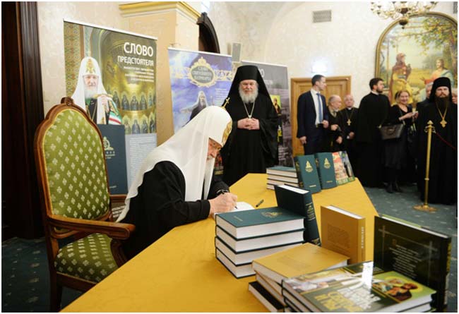 Затем Предстоятель Русской Православной Церкви подписал экземпляры книг для почётных гостей.