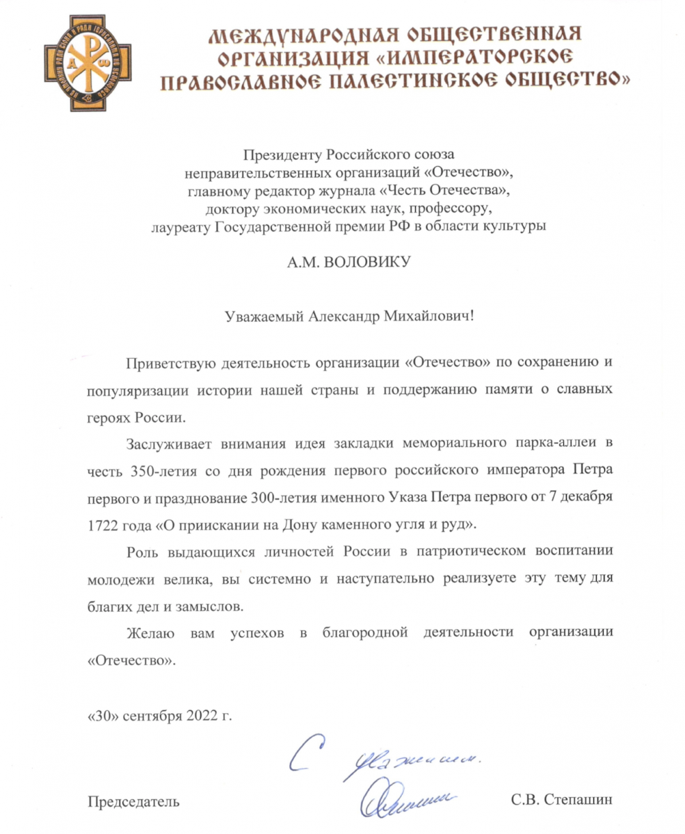 Приветствие по случаю проведения памятного мероприятия в адрес Президента РСНО «Отечество», главный редактор журнала «Честь Отечества», действительного члена Общества Александра Воловика направил Председатель ИППО Сергей Степашин.
