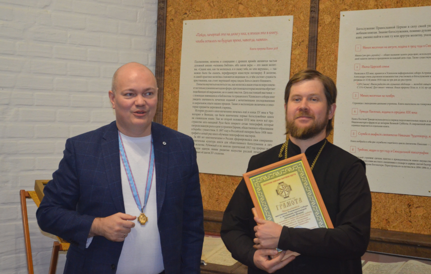 Торжественная часть собрания завершилась вручением благодарственных писем Астраханского отделения ИППО и подарков для участников проекта «Астрахань православная», а также грамот ИППО от лица Председателя старейшей в России международной общественной организации Сергея Степашина действительным членам организации Виктору Леонтьеву, Борису Пугачеву, Елене Гордиенко и настоятелю Успенского Собора г. Астрахани протоиерею Дионисию (Фокину).
