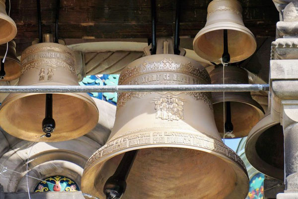 На колоколе весом 230 кг отлиты икона Святителя Николая и святой Царицы Александры, а на 100-килограммовом отлита икона святой преподобномученицы Великой княгини Елисаветы Феодоровны и инокини Варвары, на противоположной стороне – образ святого Александра Невского. В верхней части колоколов весом 230 и 100 кг выполнена надпись: «Спаси и сохрани, Господи, страну нашу российскую и верных чад ея в рассеянии сущих».