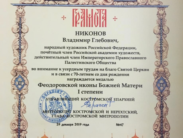 В её работе приняли участие заместитель руководителя Культурно-просветительской секции ИППО Павел Карпухин, действительный член ИППО митрополит Костромской и Нерехтский Ферапонт. Владыка вручил народному художнику России, действительному члену Общества Владимиру Никонову медаль Феодоровской иконы Божией Матери I степени в связи с 70-летием со дня рождения известного мастера.