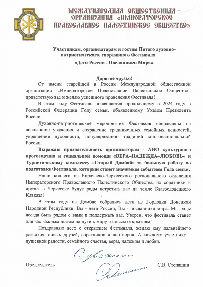 В этом году партнером Фестиваля стало Карачаево-Черкесское отделение Императорского Православного Палестинского Общества. Приветствие участникам Фестиваля направил Председатель ИППО Сергей Степашин.