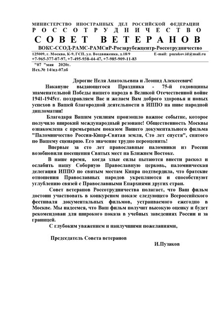 Председатель Совета ветеранов Россотрудничества Игорь Пузаков дал высокую оценку документальному фильму ИППО «Паломничество Россия – Кипр – Святая Земля». Премьера фильма прошла в Доме русского зарубежья им. А. Солженицына 11 марта 2020 года.