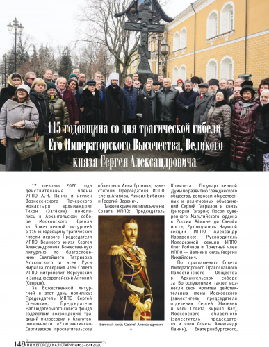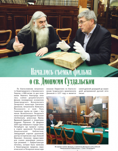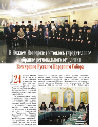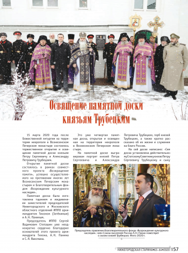 По традиции в номере рассказано обо всех важнейших мероприятиях, прошедших на территории Нижегородской митрополии: 55-летний юбилей игумена Печерского монастыря архимандрита Тихона (Затёкина); фильм «Алексей Нейдгард. Ревностный создатель храмов Божиих» – лауреат телевизионного фестиваля «Радонеж»; принятие новых членов в Нижегородское отделение ИППО; 115-я годовщина со дня трагической гибели Великого князя Сергия Александровича, первого Председателя ИППО; Нижегородскому Вознесенского Печерскому монастырю передан оцифрованный архив XVII века; освящение в Печерском Вознесенском монастыре в рамках программы «Возвращение памяти» гранитной доски князьям Трубецким и новая книга архимандрита Тихона (Затёкина) «Архидиаконство твое», посвящённая Великому архидиакону Константину Розову.