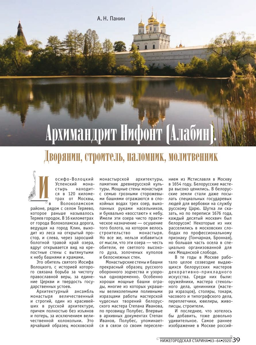 Заместитель руководителя и член Совета Московского областного отделения ИППО, председатель правления благотворительного фонда «Возрождение культурного наследия» Александр Панин представил новую большую биографическую и исследовательскую статью «Архимандрит Нифонт (Алабин). Дворянин, строитель, паломник, молитвенник», основанную на архивных материалах, которые никогда ещё не были опубликованы. В статье прослеживается жизненный путь архимандрита Нифонта (Алабина), постриженика Свято-Троицкой Сергиевой Лавры, возглавлявшего впоследствии Саввино-Сторожевский и Иосифо-Волоцкий монастыри.