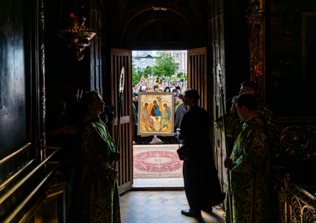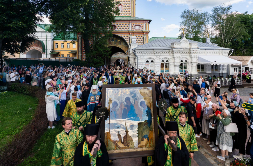 Святейший Патриарх Кирилл возглавил принесение иконы Святой Троицы, написанной преподобным Андреем Рублевым, в Троице-Сергиеву лавру и совершил в обители всенощное бдение