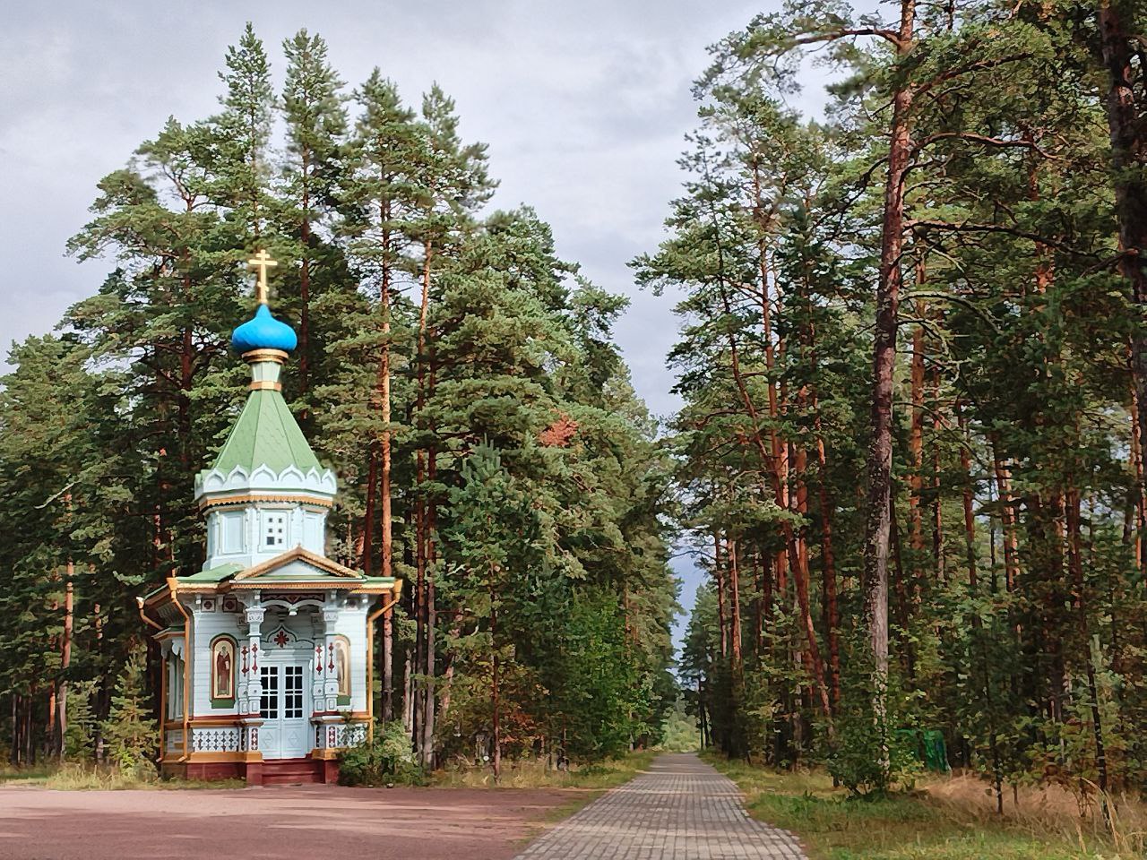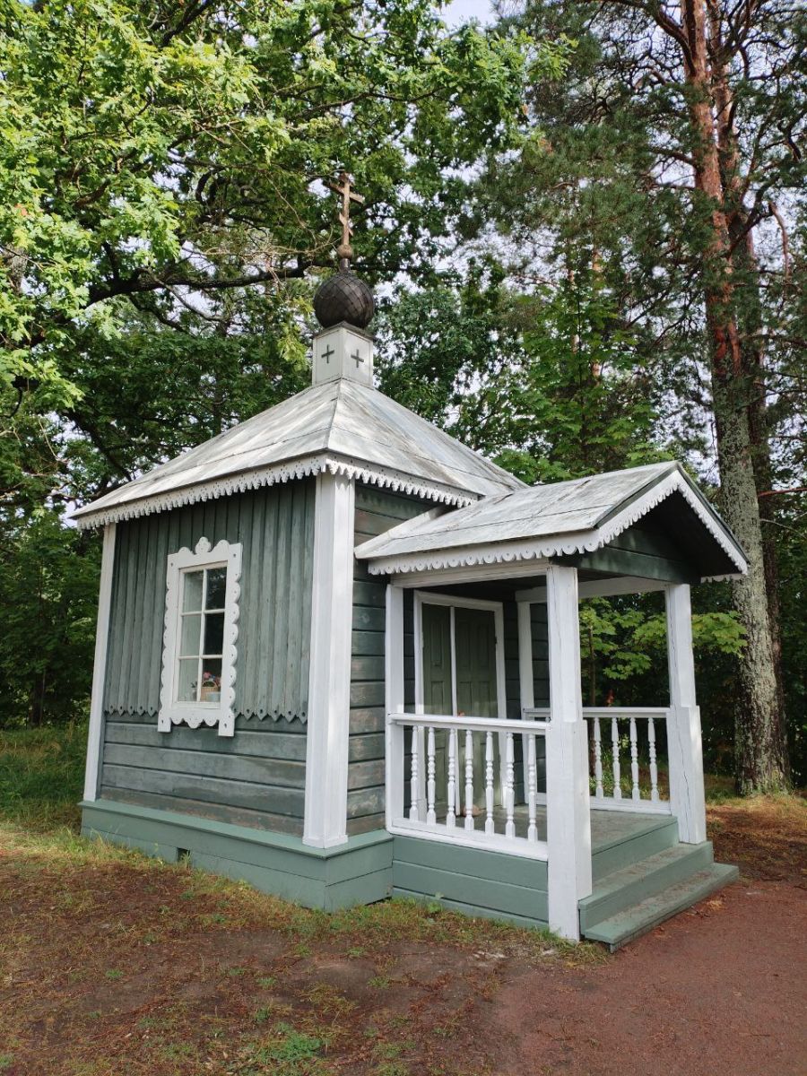 Справка: часовня Успения Божией Матери по праву считается самой красивой деревянной постройкой обители. Она выдержана в формах русского стиля: крыльцо, шатер, луковичная главка с крестом. Она была построена в 1899 году на месте деревянного поклонного креста, отмечавшего место молитв преподобного Арсения Коневского. При входе в часовню помещены изображения преподобного Арсения и святителя Евфимия Новгородского, с восточной стороны доныне сохраняется старый образ Воскресения Христова. Ныне часовня полностью отреставрирована и восстановлена силами финского Общества «Коневец». Внутреннее убранство часовни не сохранилось.