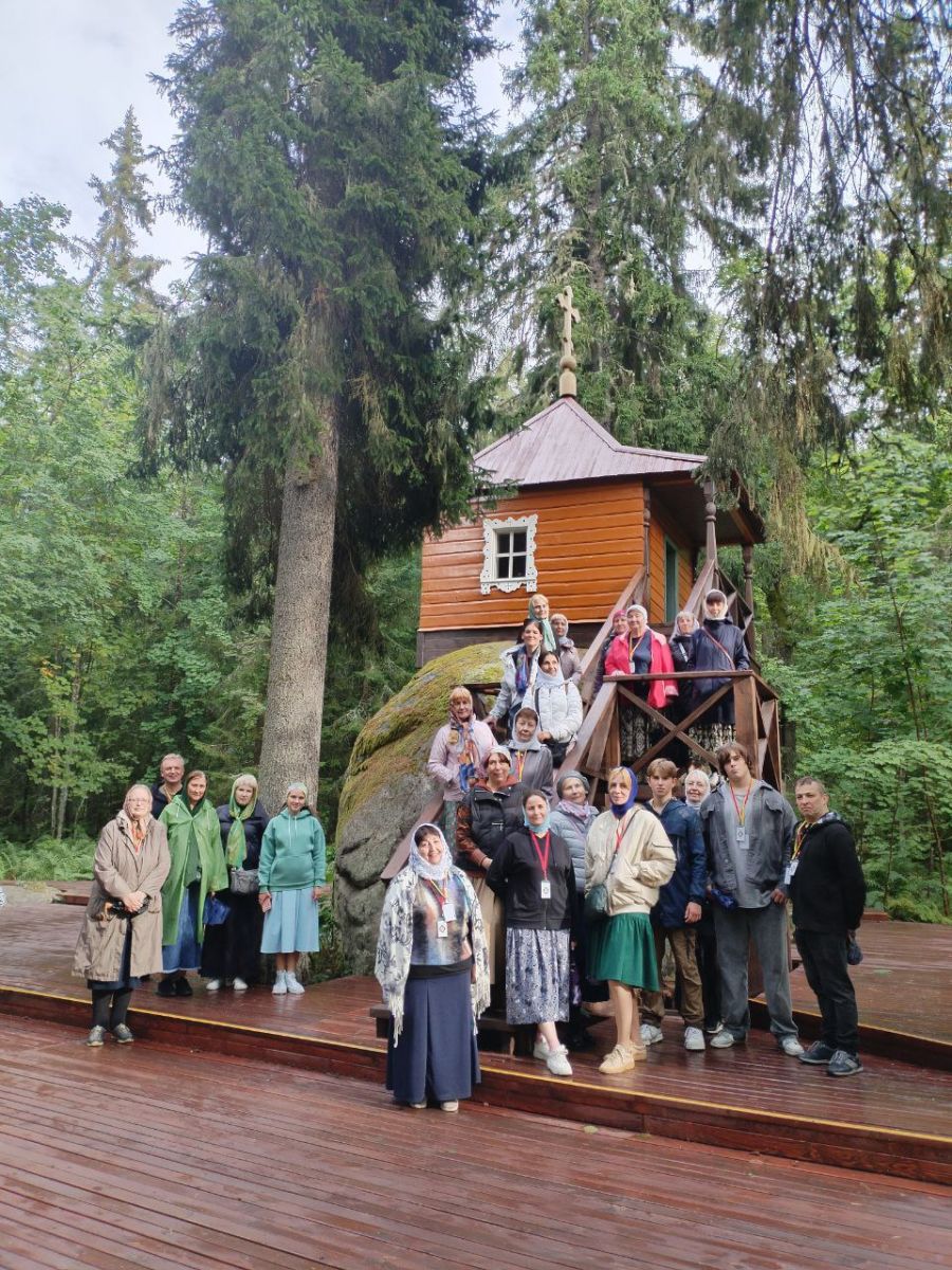По благословению наместника Коневской обители архимандрита Александра паломнической группе ИППО была предоставлена уникальная возможность посетить Казанский скит, в котором богомольцы были тепло приняты иеромонахом Зосимой. В храме, посвященном Казанскому образу Божией Матери, были пропеты тропарь и величание.