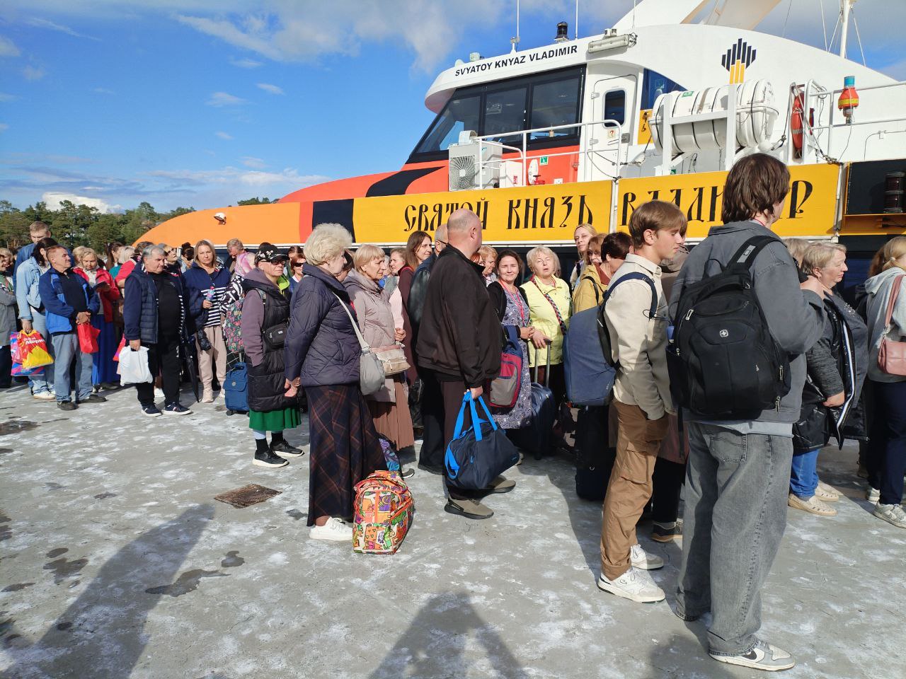 Ровно в полдень теплоход «Святой князь Владимир» вышел из бухты и направился к острову Коневец, который встретил богомольцев тучами и солнцем. До обеда мы успели посетить монастырский комплекс, нижнюю и верхнюю церкви соборного храма, поклониться главным святыням островной обители – иконе Божией Матери «Коневская» и мощам преподобного Арсения Коневского.
