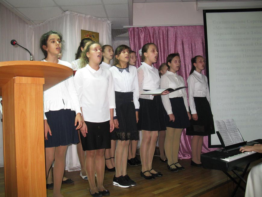 Выступления школьников сопровождалось песнями на стихи царского офицера Бехтеева в исполнении хора Новомосковской музыкальной школы.