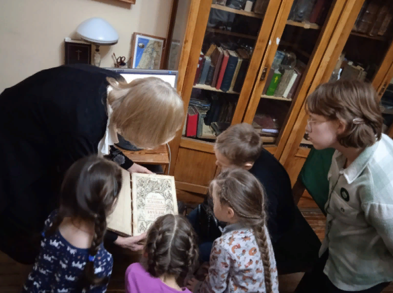 Далее маленькие гости узнали о том, как и в каких книгах Священного Писания рассказывается о представителях животного мира; рассмотрели изображения тех животных, которые обитают в библейских землях; услышали истории из жизни преподобных Герасима Иорданского, Серафима Саровского, Сергия Радонежского, заботившихся о птицах и животных, окружавших их (фрагменты жизнеописания преподобного Герасима были зачитаны из «Палестинского сборника» 1907 года); узнали об изображении живых существ (ангел, телец, орёл, лев), которые усвоены евангелистам как их символы, и о том, что означают эти изображения.
