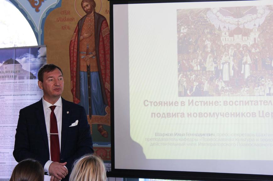 Перед участниками фестиваля с тематической лекцией «Стояние в Истине: воспитательное значение подвига новомучеников Церкви Русской» выступил старший преподаватель кафедры Православная культура и теология ИСОиП (филиала) ДГТУ в г. Шахты, пресс-секретарь Шахтинской епархии, действительный член Императорского Православного Палестинского Общества Илья Шарков. Лекция сопровождалась содержательной презентацией.