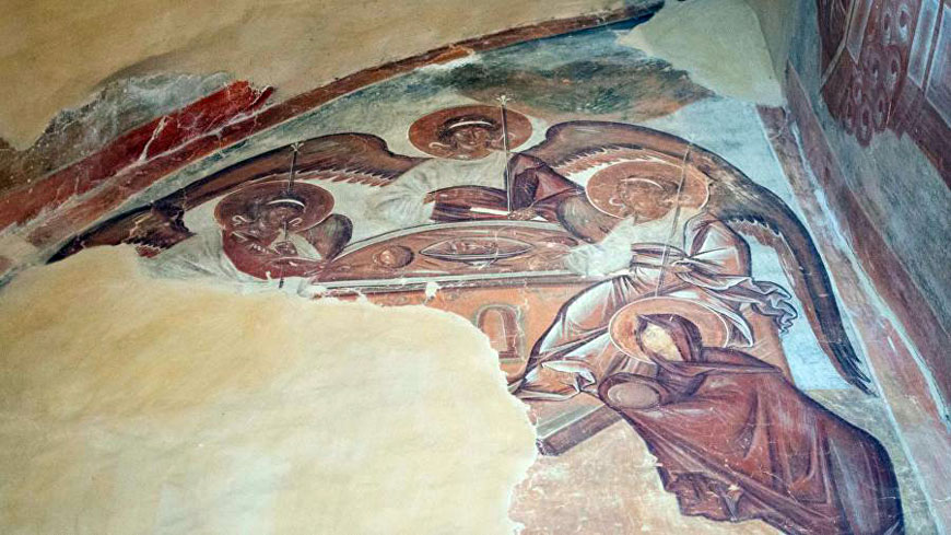 «Троица Ветхозаветная» – «Гостеприимство Авраама», фреска в Троицком приделе. Храм Спаса Преображения на Ильине. Феофан Грек, 1378 год. © РИА Новости / Александр Филиппов