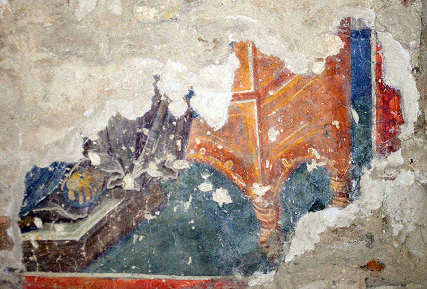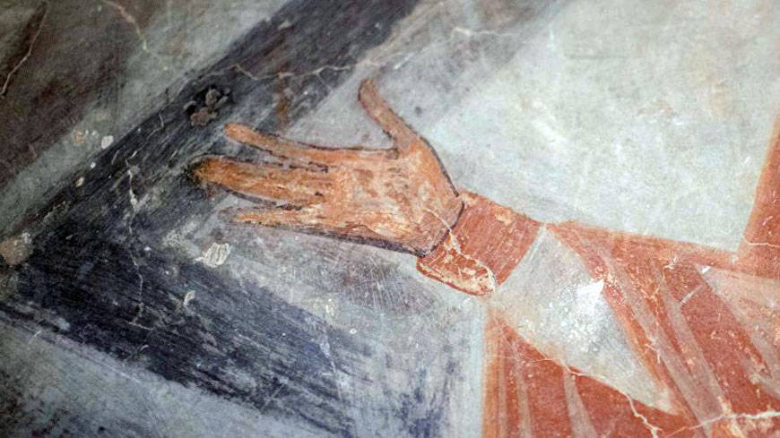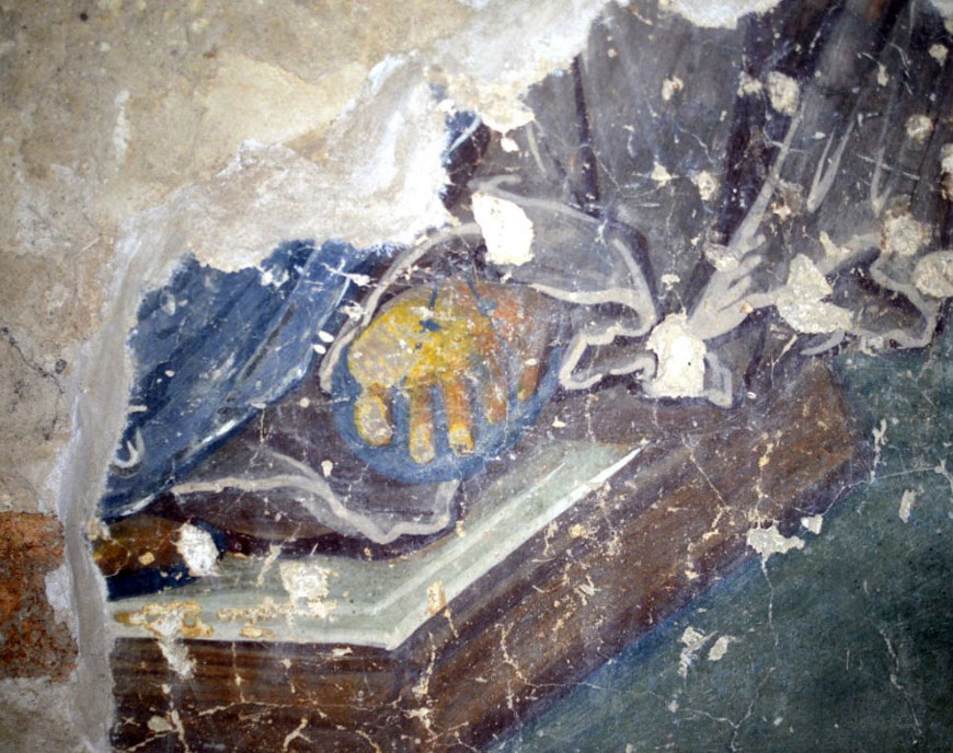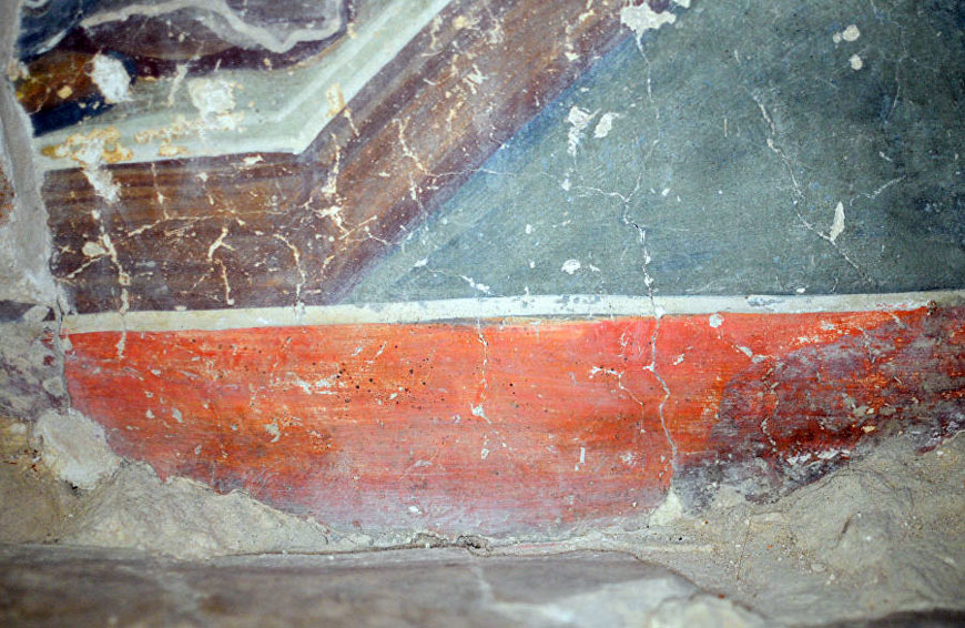 Вместе с реставратором Новгородского музея Татьяной Ромашкевич мы рассматриваем небольшой участок алтарной фрески. На ярком небесно-голубом и изумрудно-зелёном фоне – подножие, подставка для ног, выписанная землисто-коричневыми и серебристо-серыми оттенками. На подножие опирается стопа Иисуса Христа – жёлтая и оранжевая охра. Её окутывают струящиеся синие и лиловые драпировки. Трон Спасителя – оранжево-жёлтый. Разные изображения разделяет линия красной киновари.