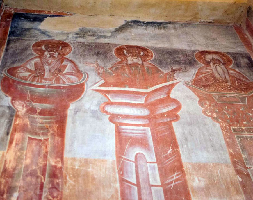 В 2015 году в Троицком приделе на изображении святого Макария Египетского выявлено вспучивание на уровне нимба с образованием трещин на площади 30 квадратных сантиметров. А десятилетием ранее, в 2005-м, на росписи в алтаре, справа от образа Христа на троне, под красной раскраской зафиксировано разрушение грунта. В 2003-м в куполе, на росписи Христа Пантократора, выпало два фрагмента, каждый площадью около одного квадратного сантиметра.