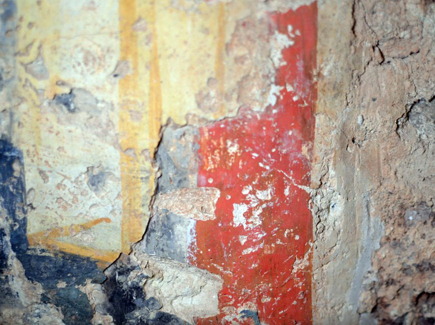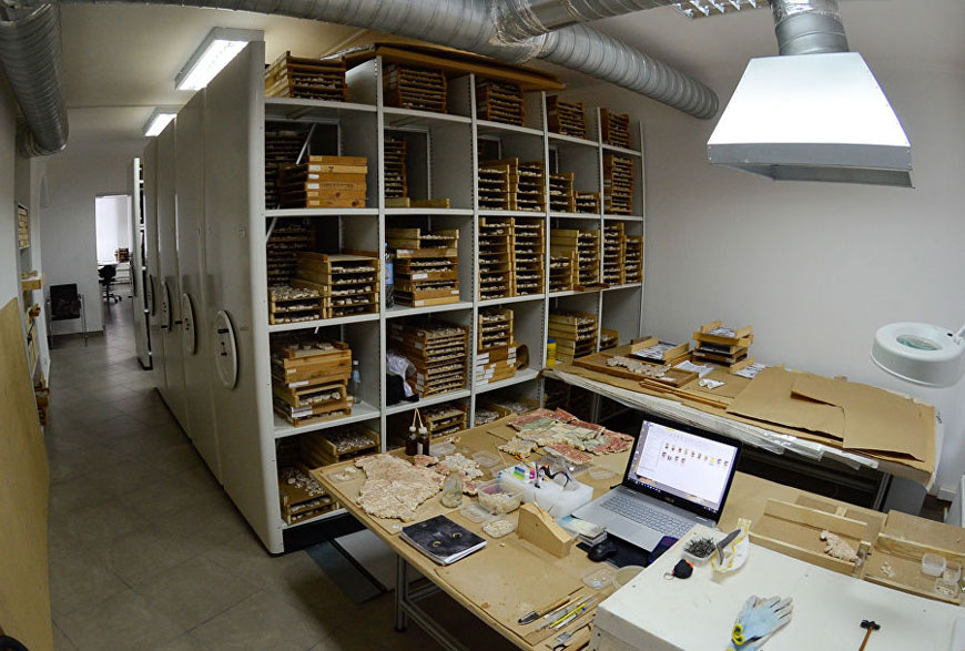 Ещё один возможный источник открытий – сбитые фрагменты стенной росписи, хранящиеся в Новгородском музее. В пяти огромных шкафах – 2300 планшетов с кусочками раскрашенной штукатурки.