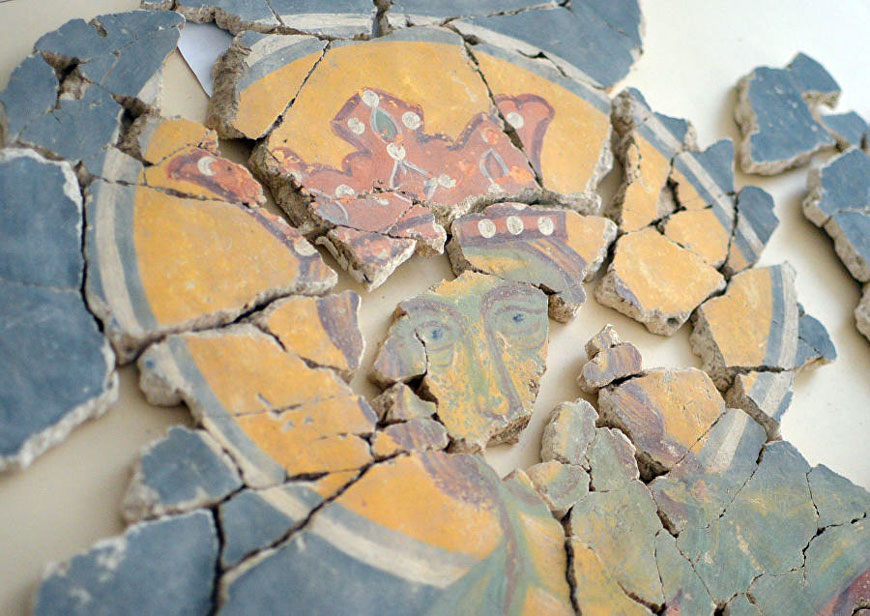 Склеенные фрагменты фресок из храма на Волотовом поле в Новгороде. © РИА Новости / Александр Филиппов