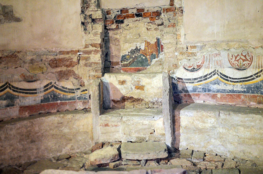 «Мы этим и занимаемся. И у нас уже есть подобранные фрагменты», – Анисимова показывает пластинку из склеенных осколков фрески Феофана. Но большая часть росписей всё ещё похоронена в подсыпке пола в центральной части храма, ведь раскопки проводились только в алтаре.