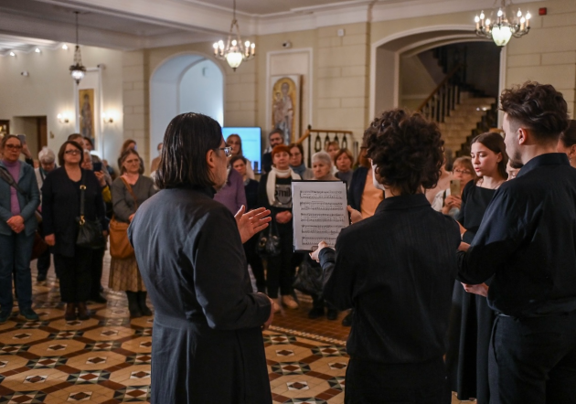Особую атмосферу вечера создало выступление камерного хора ПСТГУ под управлением и. Алексея Зайцева. Хор исполнил песнопения Страстной седмицы и духовный кант «Грешный человече».