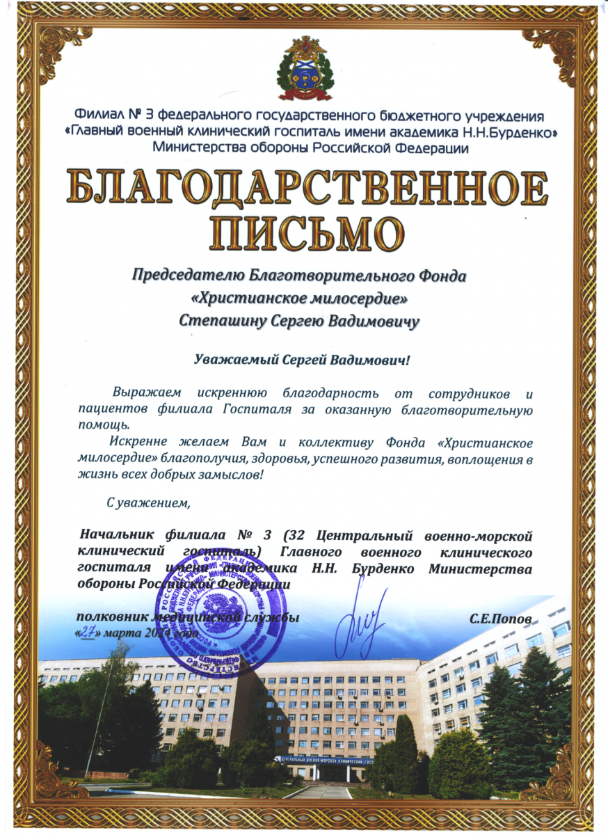 В адрес Председателя старейшей в России международной общественной организации, Председателя Благотворительного Фонда «Христианское милосердие» Сергея Степашина поступило благодарственное письмо от начальника филиала №3 (32 Центральный военно-морской клинический госпиталь) Главного военного клинического госпиталя имени Н.Н. Бурденко Министерства обороны Российской Федерации С.Е.Попова.