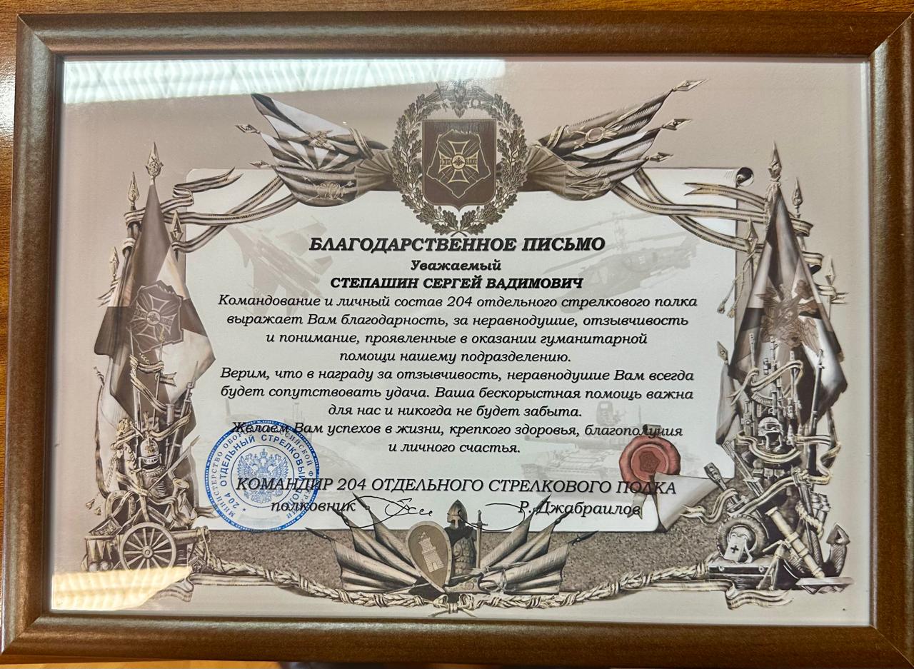 Сергей Михайлов передал Сергею Степашину Благодарственное письмо от командира 204 отдельного стрелкового полка полковника Р.Джабраилова. Благодарность вручена с формулировкой: «Командование и личный состав 204 отдельного стрелкового полка выражает Вам благодарность за неравнодушие, отзывчивость и понимание, проявленные в оказании гуманитарной помощи нашему подразделению».