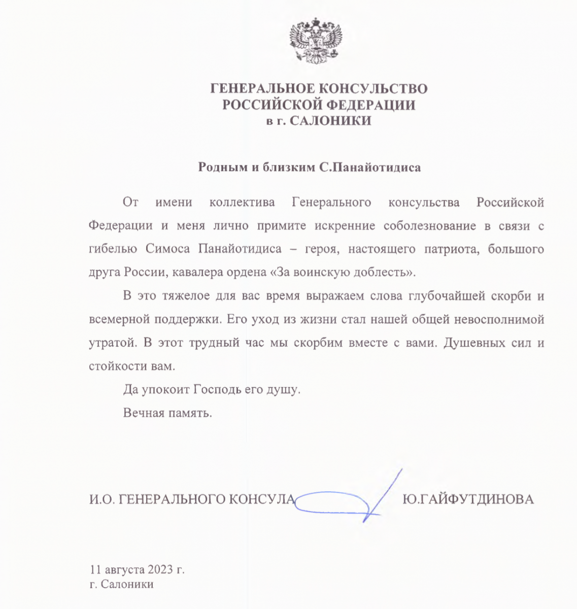 В адрес родных и близких Симоса Панагиотидиса поступило соболезнование из Генерального консульства РФ в г. Салоники (Греция)