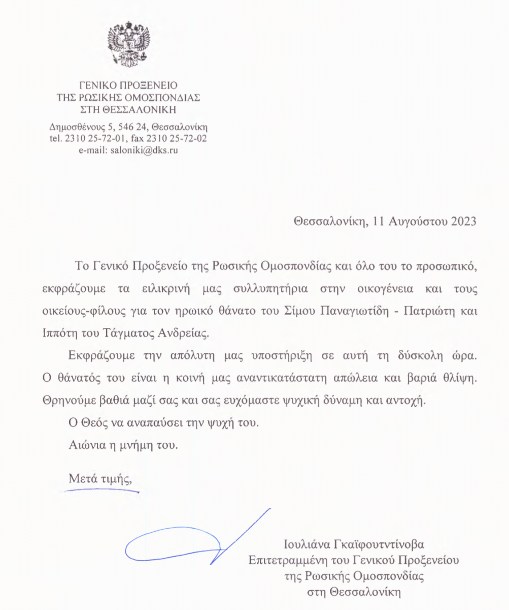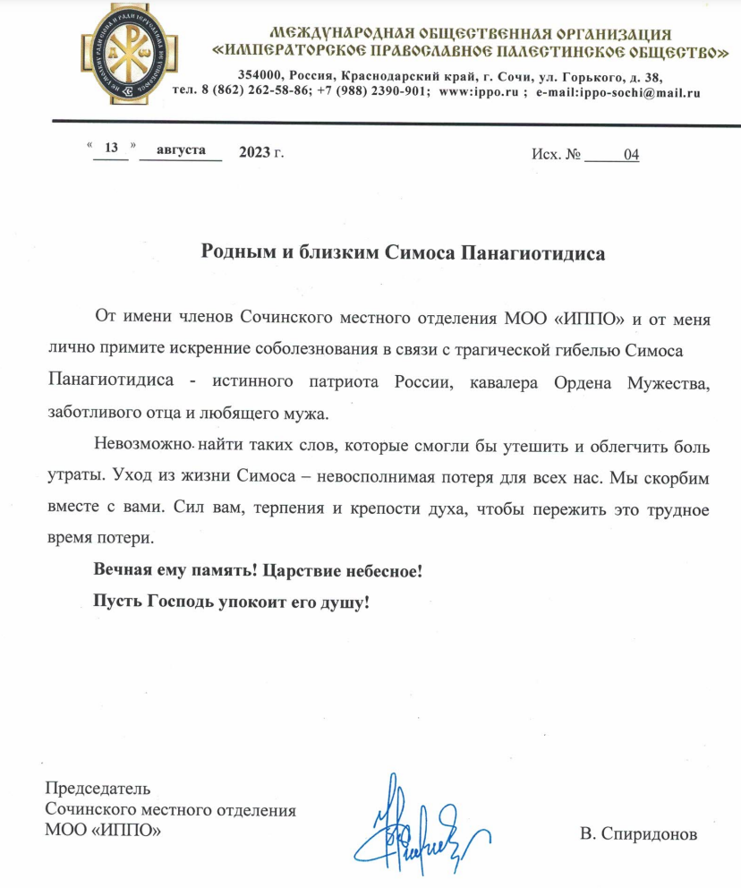В адрес родных и близких официального представителя Общества в ДНР, ЛНР, Запорожской и Херсонской областях, руководителя Представительства ИППО в Греции Симоса Панагиотидиса поступило соболезнование из Генерального консульства РФ в г. Салоники (Греция).