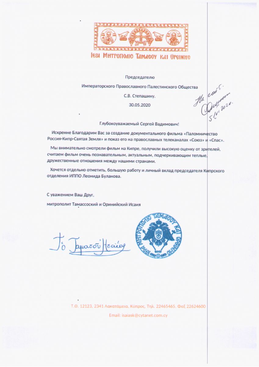 Председатель ИППО Сергей Степашин получил благодарность от митрополита Тамассоского и Оринийского Исаии за создание документального фильма «Паломничество Россия – Кипр – Святая Земля».