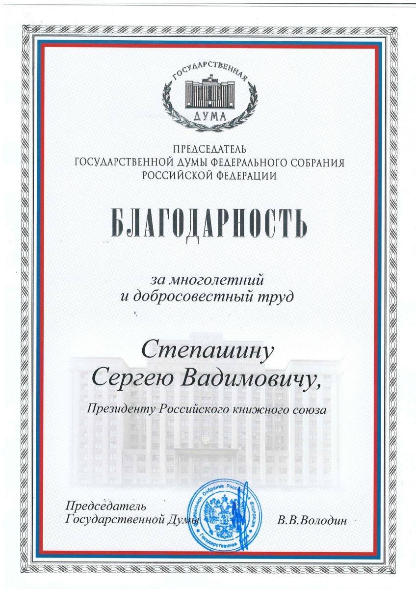 Благодарственное письмо от председателя Государственной Думы Федерального Собрания Российской Федерации Вячеслава Володина поступило в адрес президента Российского книжного союза, Председателя ИППО Сергея Степашина.